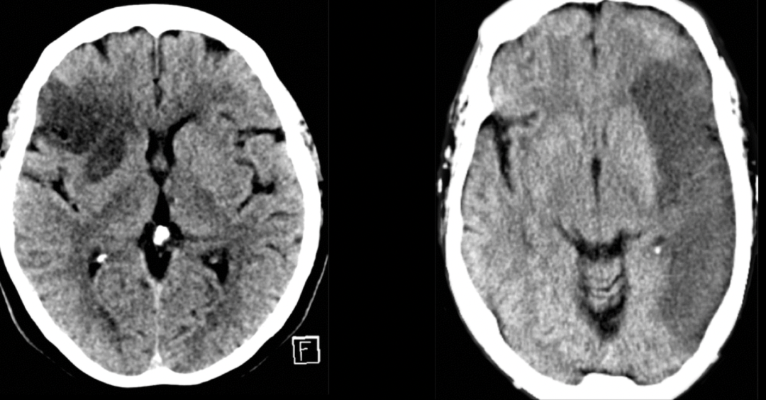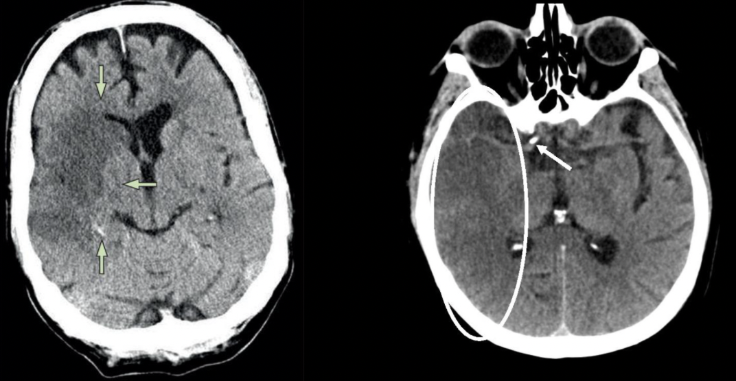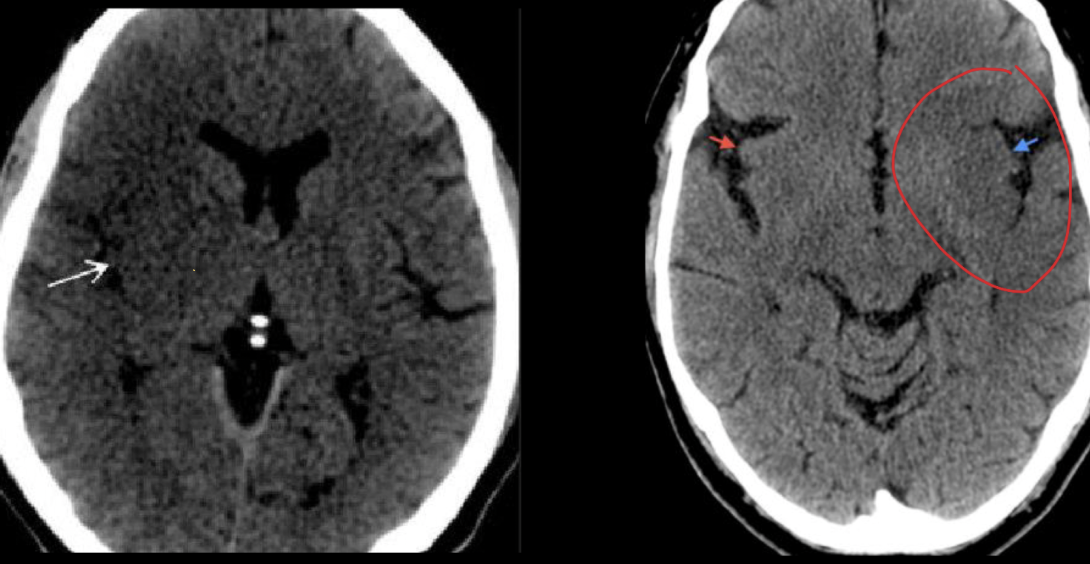 Pérdida de diferenciación de la sustancia gris y blanca en una TC vista en el EVC isquémico en fase hiperaguda