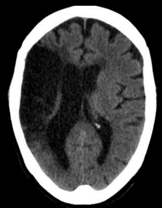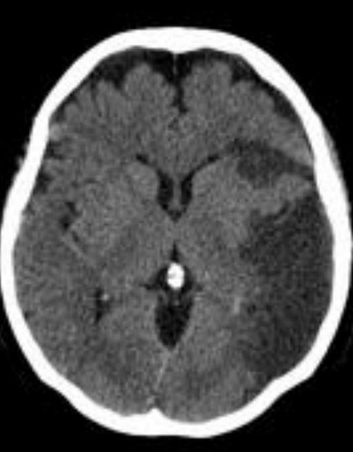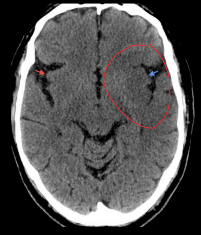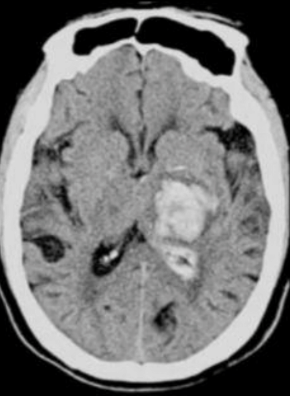 EVC hemorrágico - se ve la sangre hiperdensa y se encuentra en los ganglios basales