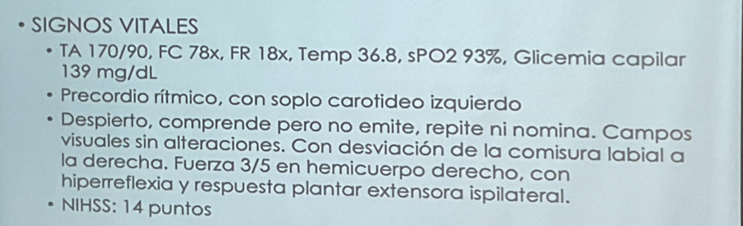 Inició el día de hoy a las 9:30 A.M. mientras desayunaba con incapacidad para emitir el lenguaje y debilidad hemicorporal derecha. Acude al servicio de urgencias 40 minutos después y a su ingreso se encuentra con los siguientes hallazgos.