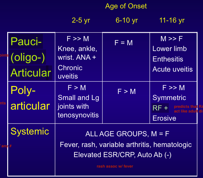 fill in table about ages, features, and subgroups of JIA
