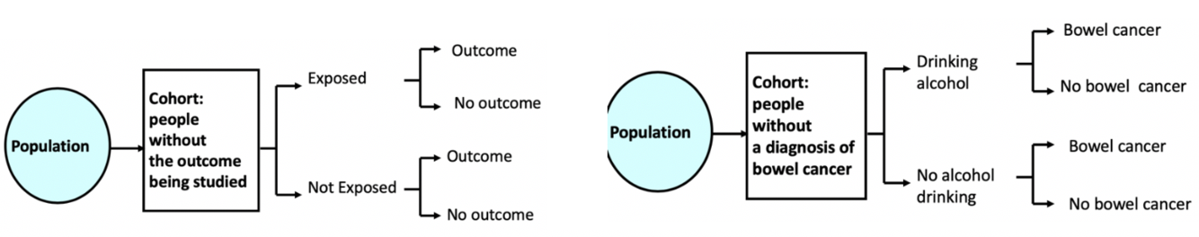 A population is picked that dont have the outcome (eg, bowel cancer) and then you pick an exposure and see the outcomes of those that were exposed to it and those that weren’t