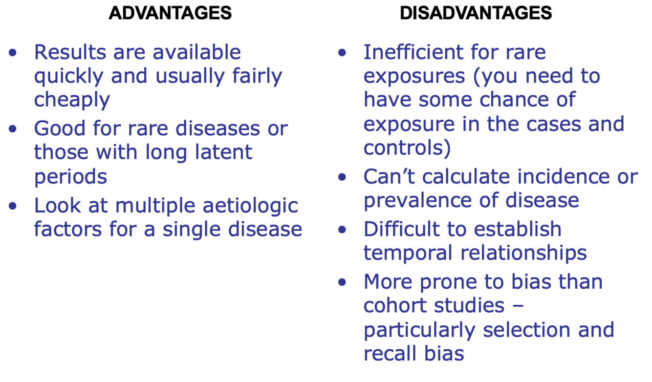 Limitations –> Difficulties with loss due to follow up (often a very large follow up period), Can have problems with bias, exposures can also happen after diagnosis (eg drinking to cope with a cancer diagnosis)