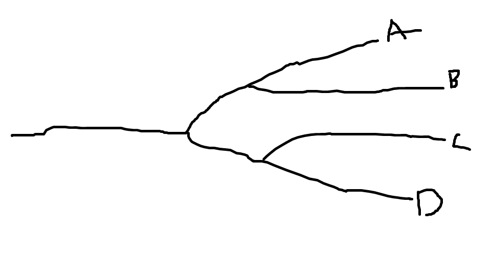 The cladogram below shows the classification of species A to D. Deduce how similar species A is to species B, C and D.