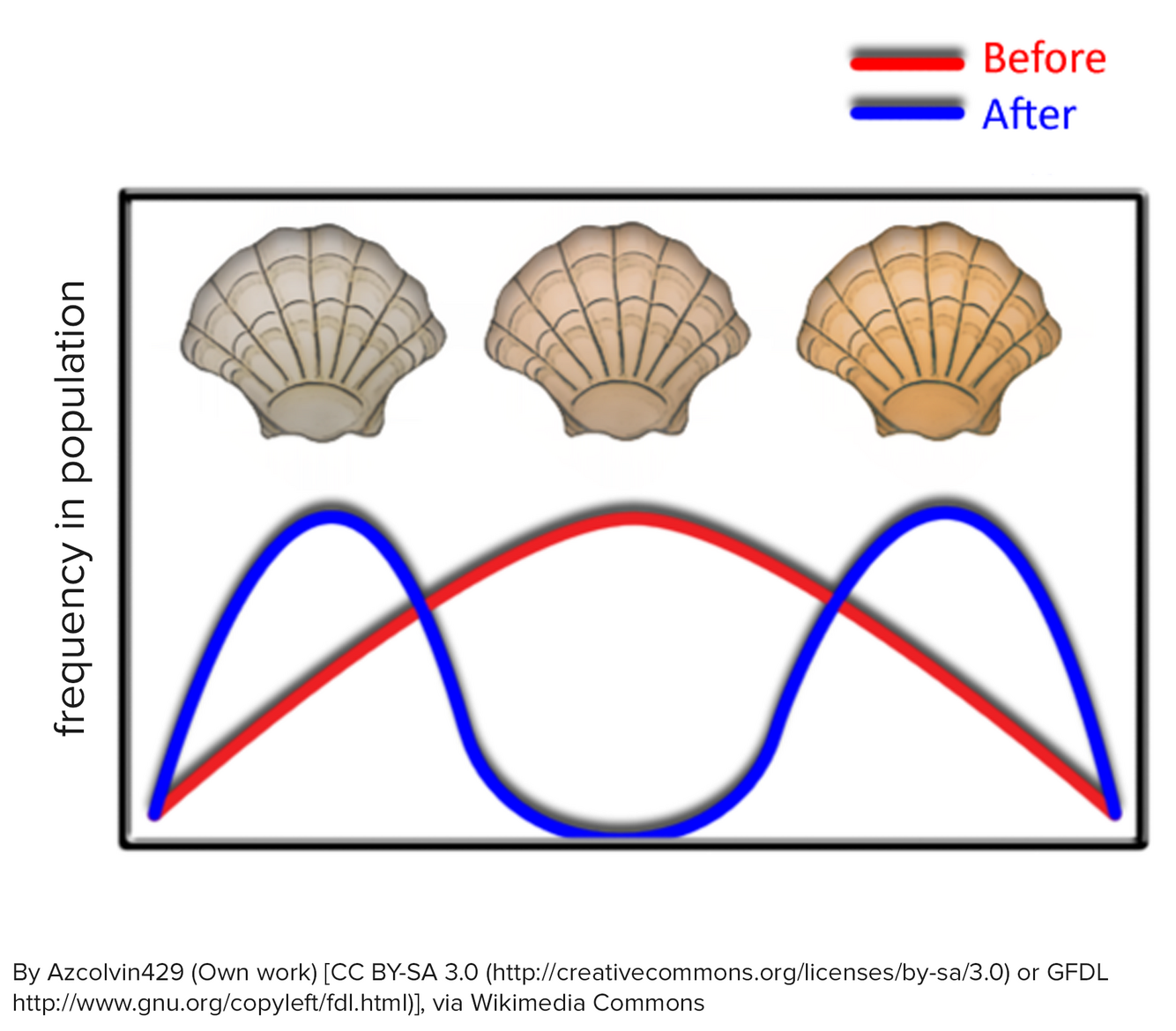 Disruptive selection occurs when extreme traits are advantageous while moderate traits are not. As a result, the frequencies of the extreme phenotypes increase over time.
