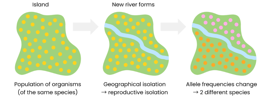Geographical isolation leads to reproductive isolation. This then allows differences in gene pools to accumulate.