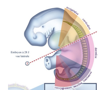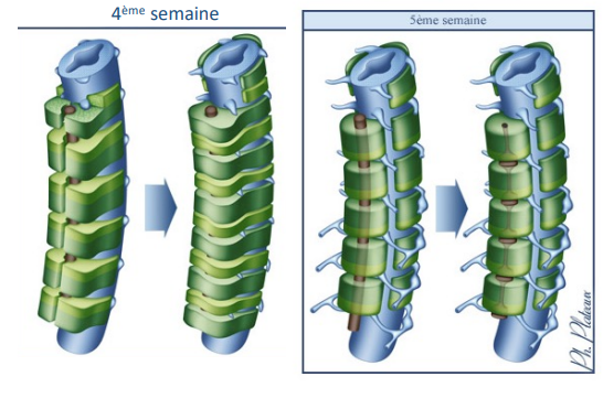 A la fin de la 4e semaine, chaque bloc de sclérotome (un dans chaque métamère) se divise en 2 contingents : un antérieur et un postérieur