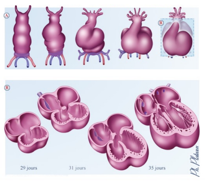 Il va subir une morphogenèse complexe, avec une plicature et un cloisonnement des cavités aboutissant à la formation du coeur à 4 cavités