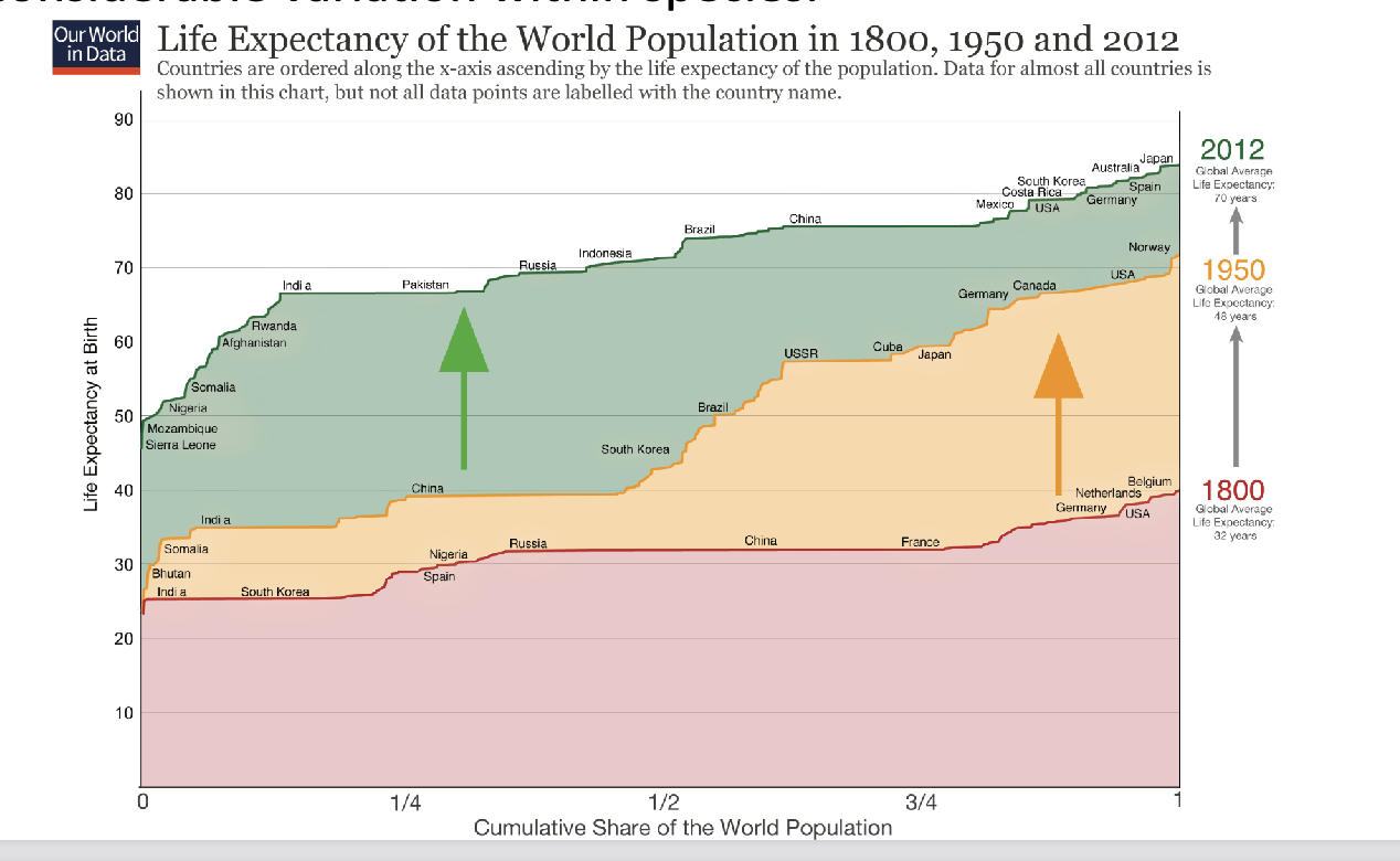 Image: Life expetetcy in humans in different countires across time periods – have varaition across popultioms amd varaition across time