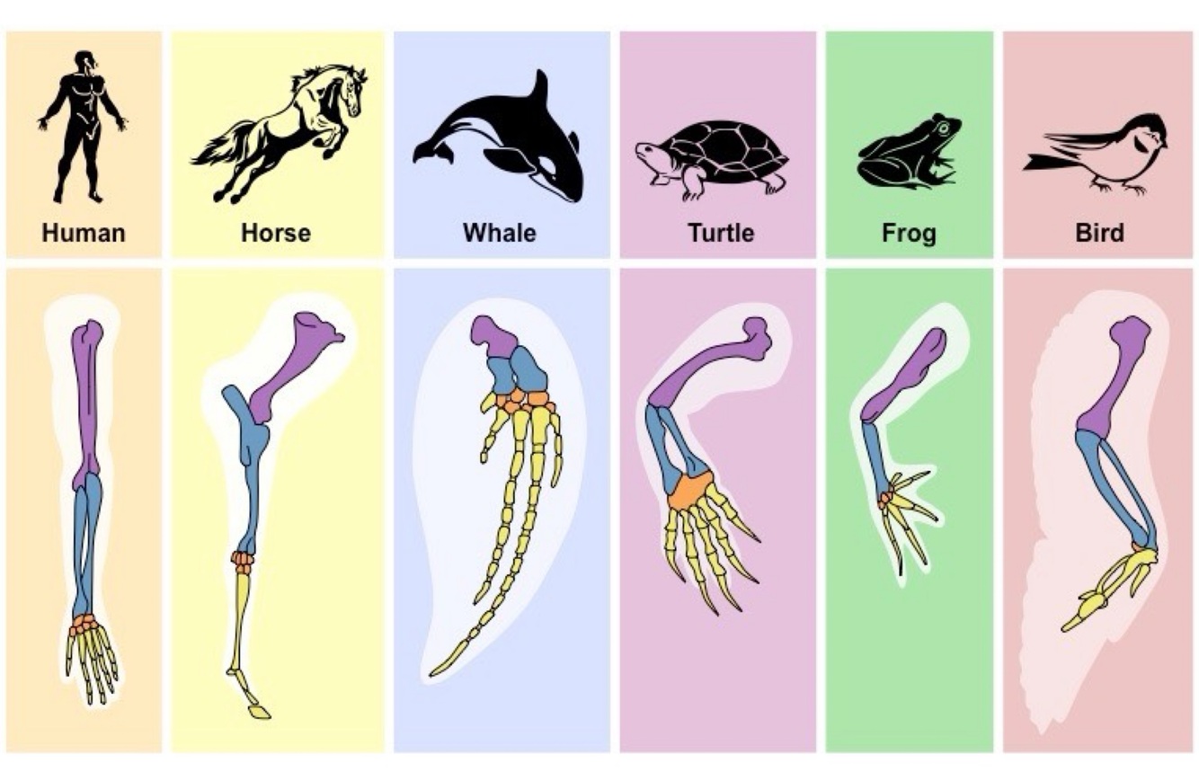 Structures within different organisms or species that are similar to that of a common ancestor. E.g. the genetic code, all organisms have same nucleotide bases, which make up their respective DNA and RNA. The pterodactyl limb which shares the same 3 main forearm bones — ulna, radius and humerus — with the human arm, frog arm and whale fin.