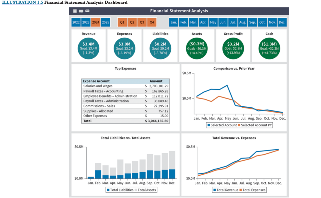-The visualizations in the dashboard provide an analysis of revenue and expenses, total assets and total liabilities, and a visualization that allows the user to choose an account to view compared to the prior year.