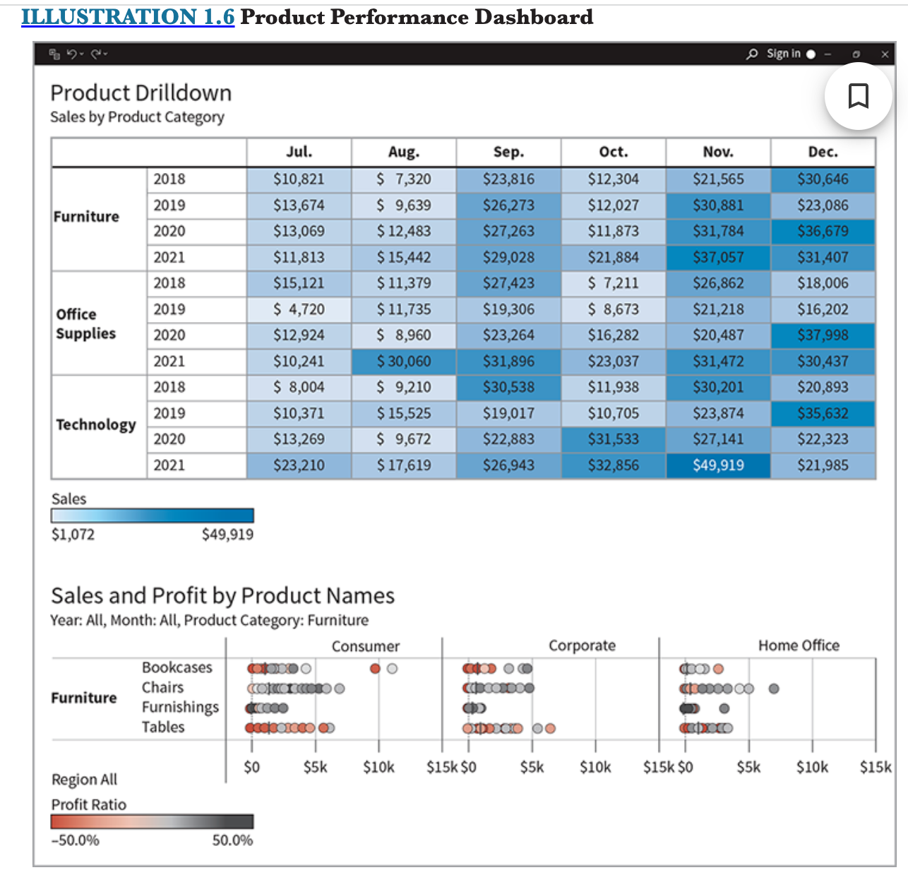 The top visualization in the dashboard is called a highlight table. The colors are on a scale from light to dark. Darker colors indicate higher sales and lighter colors indicate lower sales. User can quickly locate high performing and low performing products. For example, the darkest color is technology sales in 2021 in the month of November.