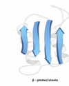 Folding pattern where neighboring polypeptide regions align side by side with hydrogen bonds, forming a flat/pleated structure; found in silk and amyloid fibers.