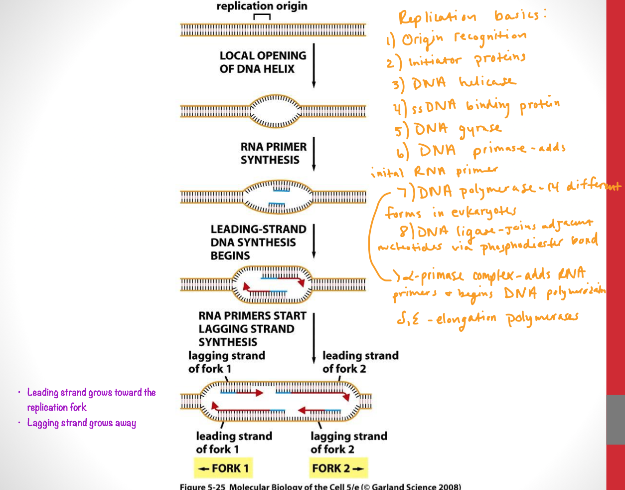 What direction do the leading and lagging strand grow in relation to the replication fork?