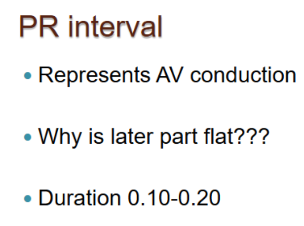 PR interval = atrial depolarization + AV nodal delay; flat portion is when atria is fully depolarized and there is no electricle current while the AV node conducts the signal (delay)