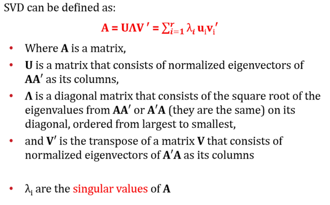 It is a data reduction technique that can helps us reduce the data down to “x” unique pieces of information. This technique not only reduces the data to a more easily digested format, but it also indicates how important each piece of information is towards predicting future similar data.