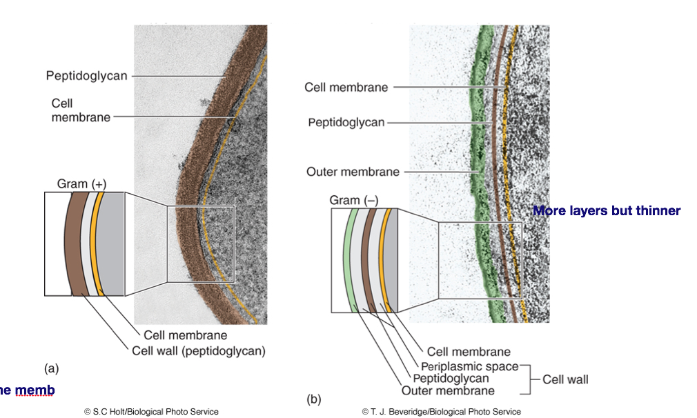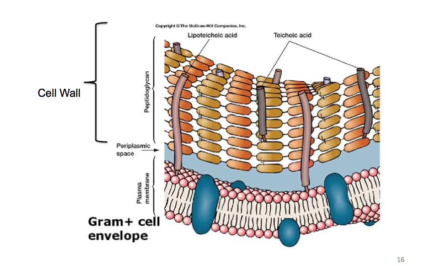 thick wall composed primarily of peptidoglycan and cell membrane about 20-80 nm thick- contain lipoteichoic acid and teichoic acid