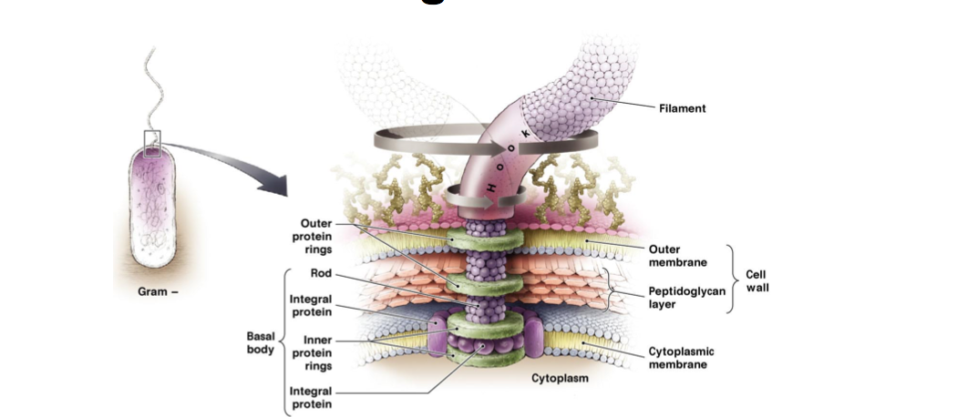 basal body anchors filament and hook to cell wall by a rod and series of rings