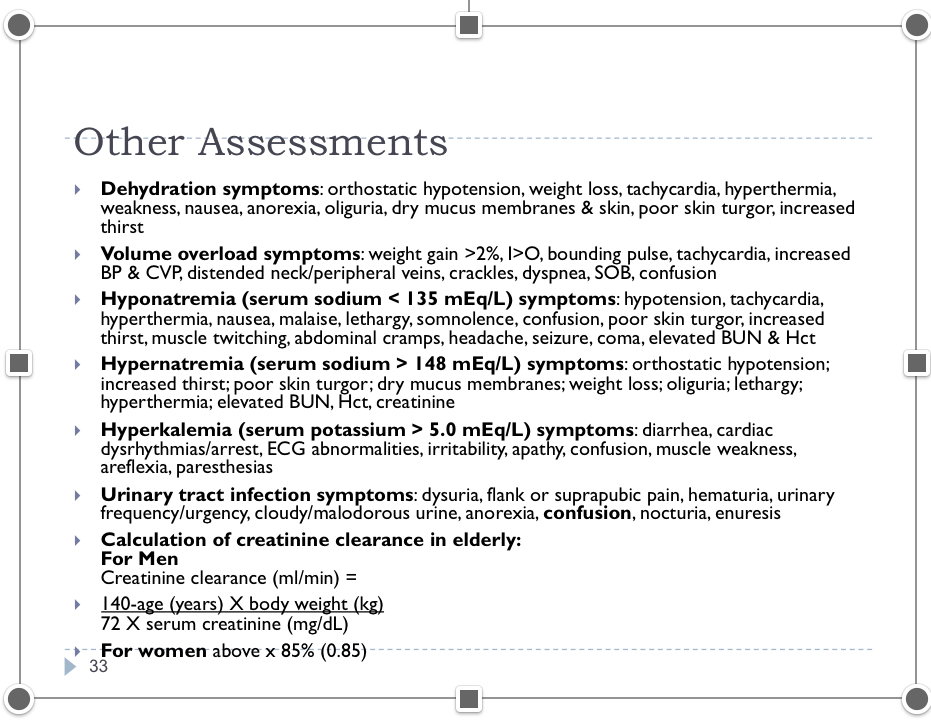 o Potential for adverse drug reactions or toxicity because they are not clearing their systems o Pain o Risk for Infection - UTI o Risk for Falls they are up in middle of night, fall and trip its dark o Need for toileting assistance o Potential for skin breakdown o Sleep disruption o Potential for social isolation