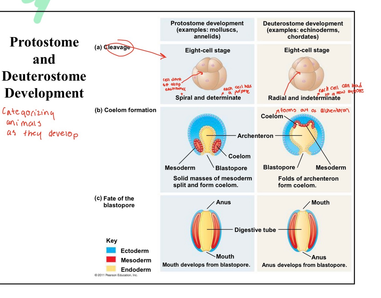 Triploblastic: 3 germ layers: Ectoderm - leads to skin and nervous system, Endoderm - leads to digestive system, Mesoderm (middle) - leads to everything else (circulatory, bone, muscle, etc)