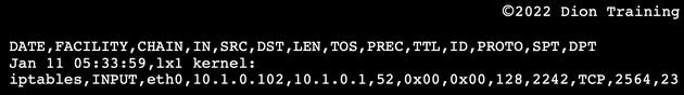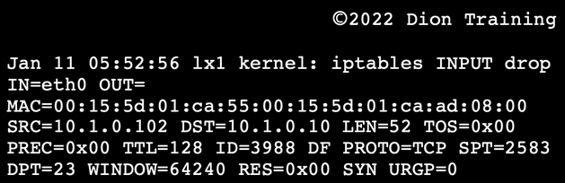 grep “10.1.0.10,” firewall.log | grep “23$”