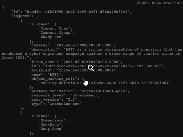 A JSON excerpt that describes an APT using the Structured Threat Information eXpression (STIX) format