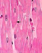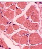 Voluntary; Neuromuscular Junctions; long, unbranched peripheral multiple nuclei; NO MITOSIS (fibrosis if damaged); Satellite cells mitose=regeneration.