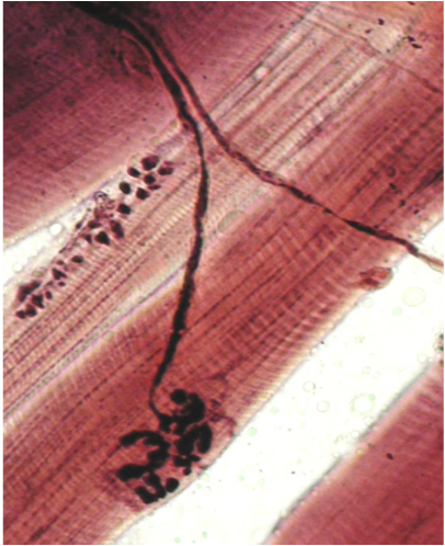 Striated skeletal muscle. Note the neuromuscular jxn and long axon.