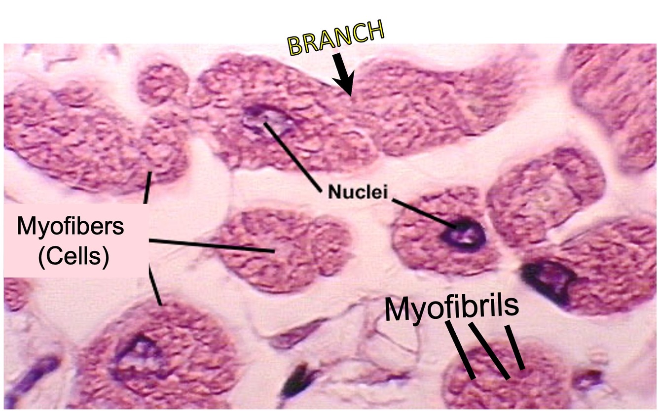 Branched cells, One central nucleus, Myofibrils