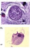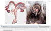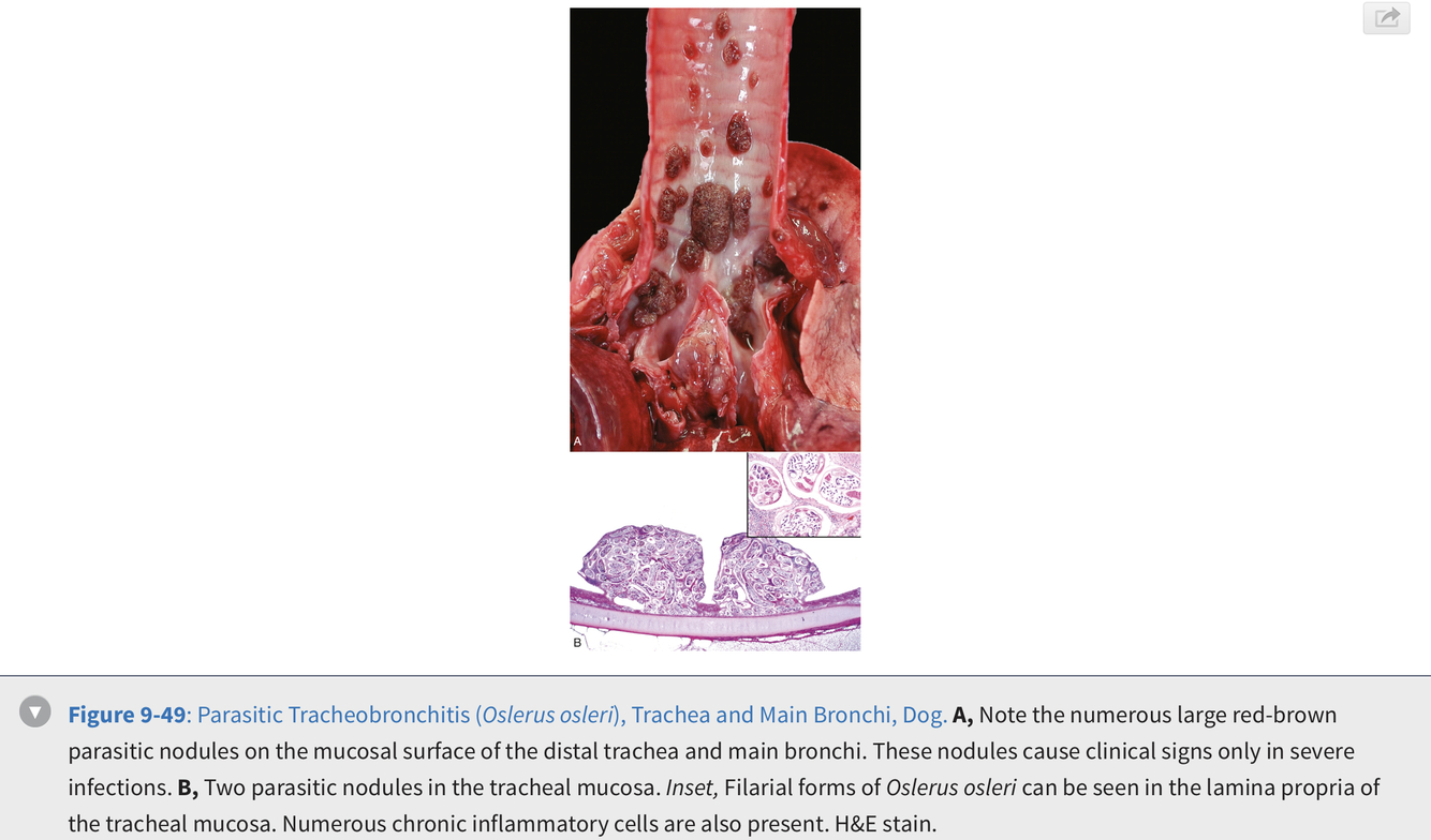 -Parasitic: Oslerus (Filaroides) osleri. Nematode parasite that causes characteristic protruding nodules into the lumen at the tracheal bifurcation. Seen in endoscopic examination or necropsy. When the parasite dies an intense foreign body reaction develops with neutrophils and giant cells. From asymptomatic to Chronic cough that can be exacerbated by exercise or excitement. Dyspnea, cyanosis, exercise intolerance, emaciation, even death in young dogs.