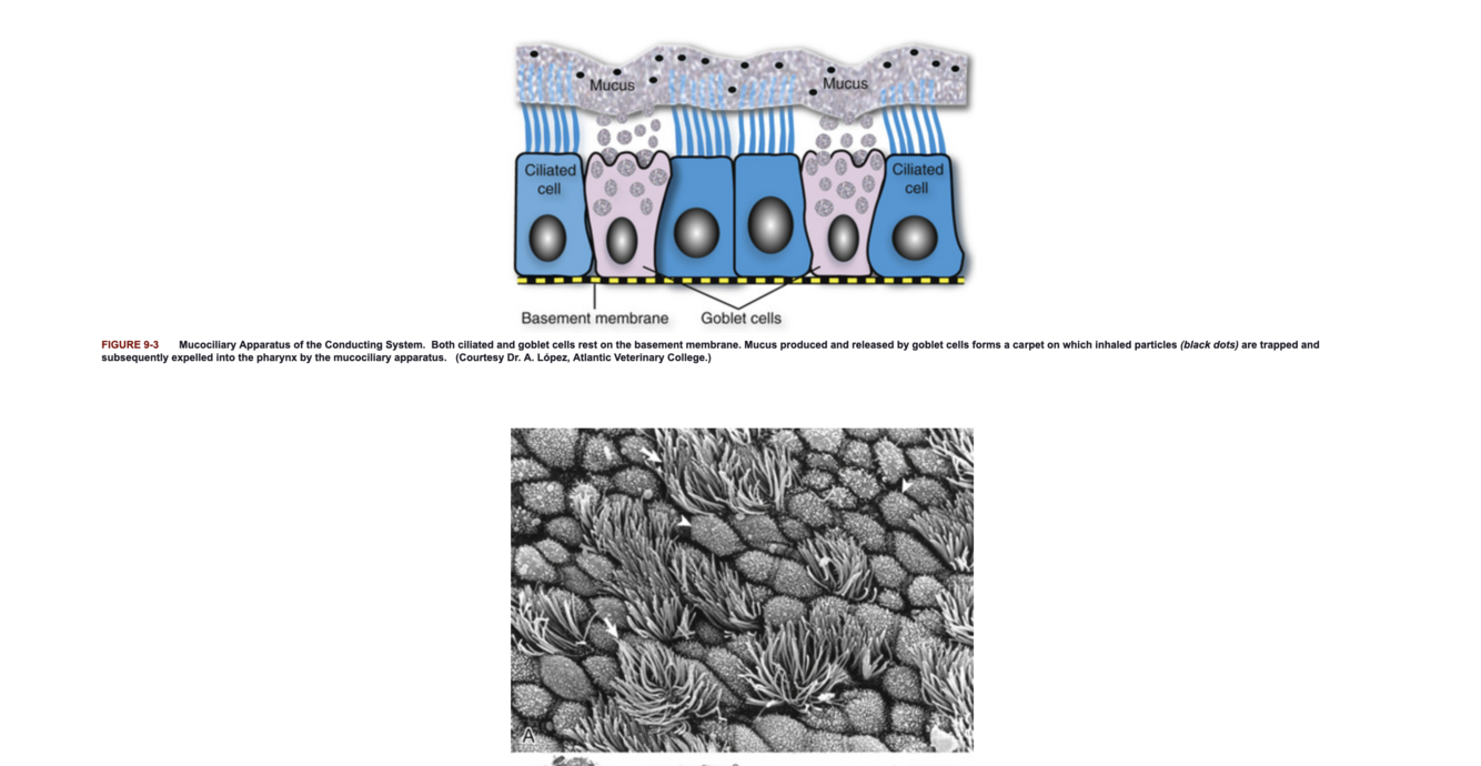 Mucociliary escalator, modified epithelial cell, at bifurcation of Bronchi and Bronchioles overlaying BALT.