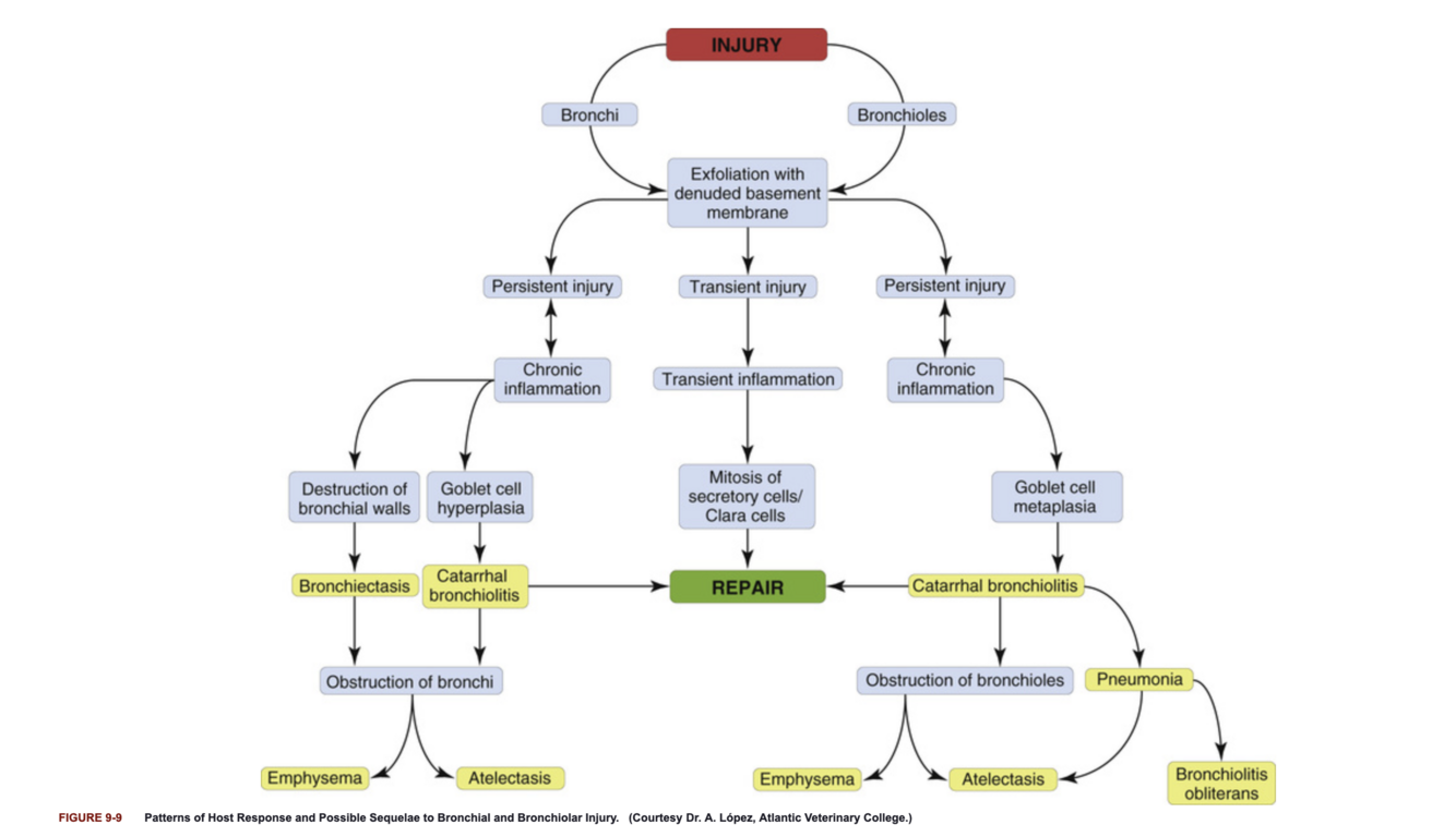 Chronic Injury = Goblet cell hyperplasia leads to excessive mucus production (hyper secretion) and reduced mucociliary clearance, when there is loss of basement membrane then fibrosis repair and granulation tissue take place.