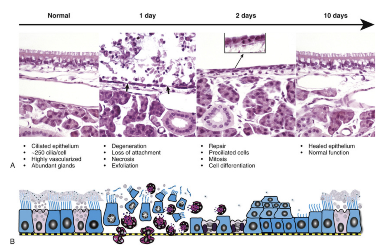 -Injury to pseudo stratified columnar epithelium: viral infection, trauma, inhalation of toxic gases, cells swell, lose attachment to basement membrane and exfoliate, cell migration (conciliated secretory cells/preciliated cells), mitosis and finally attachment. TRANSIENT MILD EXUDATE: fluid, plasma proteins, and neutrophils.