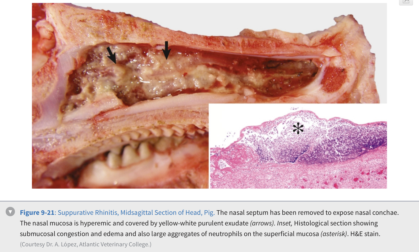 Pasteurella multicocida type A and D, cytotoxins, destruction of turbinate.