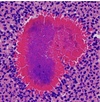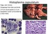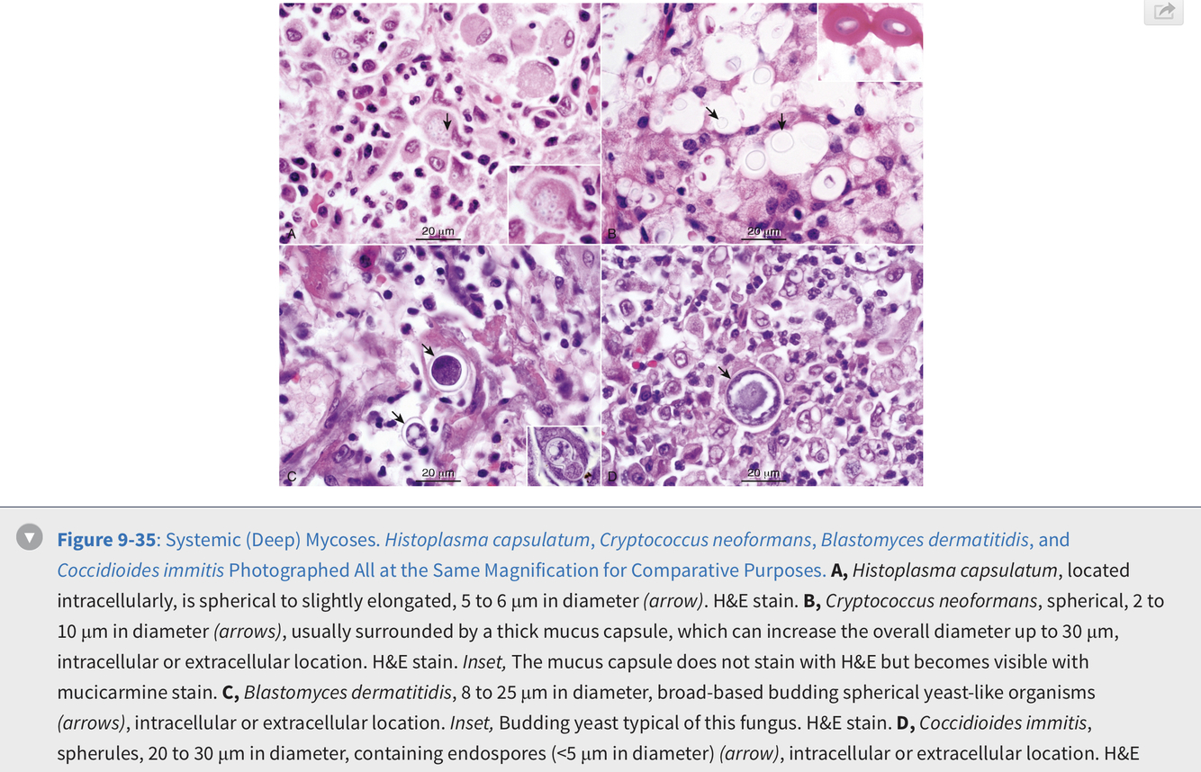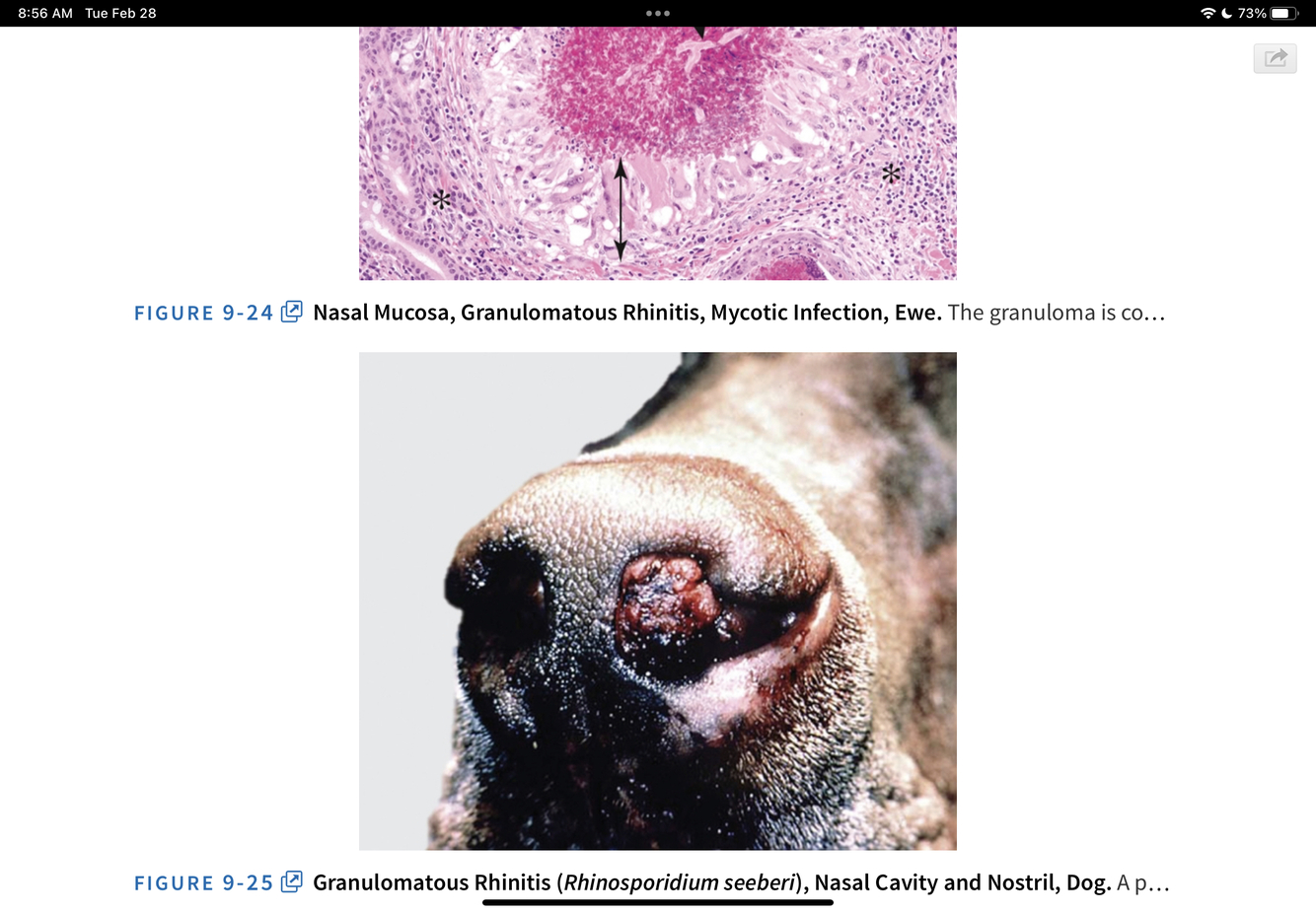-Cryptococcus neoformas: lesions are characterized by mucosal granulomas containing acid-Schiff (PAS)-positive fungal organisms, and the infection is clinically characterized by mucopurulent nasal discharge. Lesions vary from nasal granulomas to large confluent masses of mucopurulent exudate entire nasal cavity and paranasal sinuses. PAS-positive organisms.