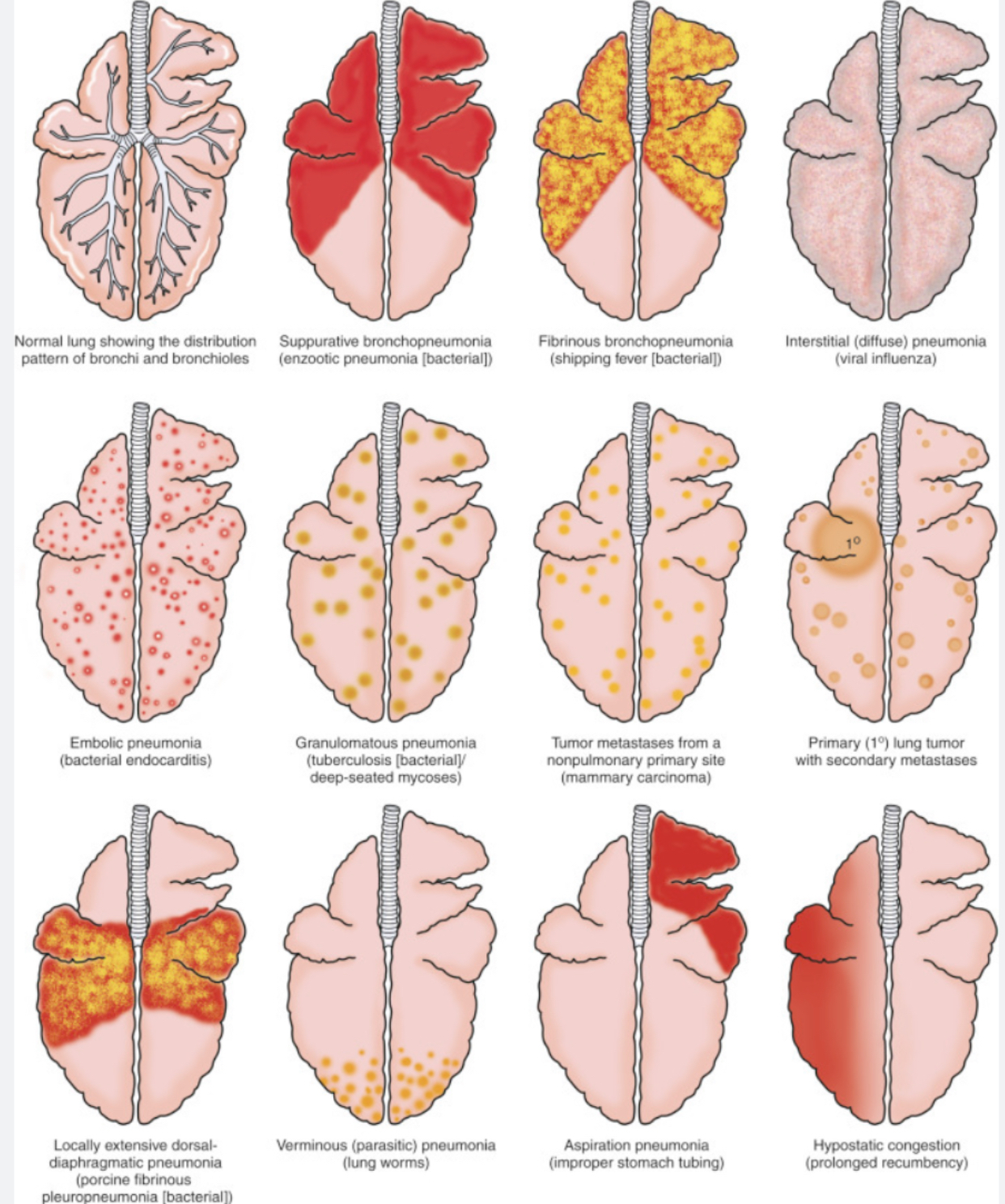 -Feline Viral Rhinotracheitis: FeHV-1 causes impairment of pulmonary defense mechanisms predisposing cats to secondary bacterial pneumonia. Low maternal immunity, stress, kittens. Lesions are fully REVERSIBLE. Secondary interstitial pneumonia can occur.