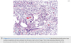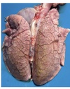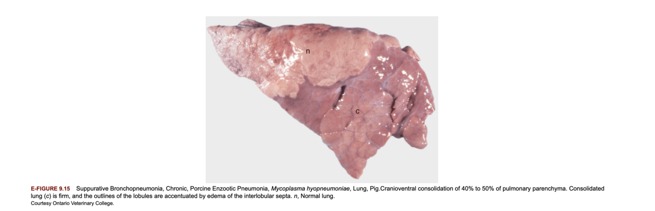 -Chronic phase, 7-10 days after infection, pale gray lungs “fish flesh” appearance. Purulent and catarrhal inflammation, obstructive atelecsis, mononuclear cell infiltration, peribronchial and peribronchiolar lymphoid hyperplasia, and early alveolar fibrosis