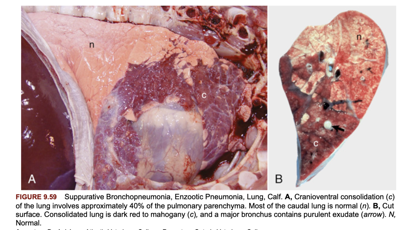 -The inflammatory process takes place in the bronchial, bronchiolar, and alveolar lumens. It is the most common type of pneumonia in domestic animals and with a few exceptions is characterized by cranioventral consolidation of the lungs.