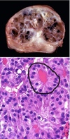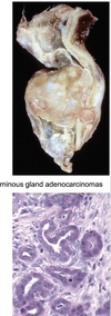 Bronchiectasis: affected bronchus is dilated and has lost its normal projections of the mucosa into the lumen, loss of mucosa, destruction of bronchial wall, fibrosis with atrophy of cartilage and bronchial glands