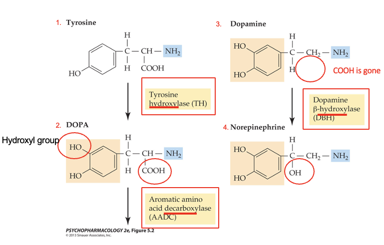 Describe the enzymes and groups added/removed to get tyrosine to DOPA, then dopamine, then to norepinephrine.