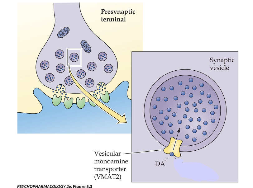 The Vesicular Monoamine Transporter-2 (VMAT2) is an active transporter that slurps up dopamine and NE to be stored at high concentrations within the neuron.