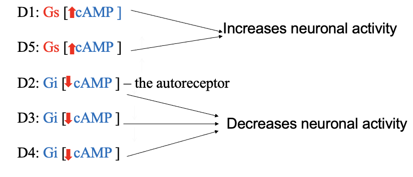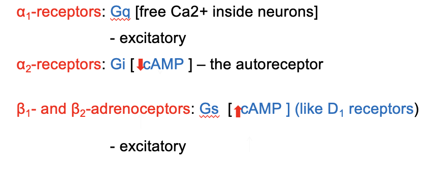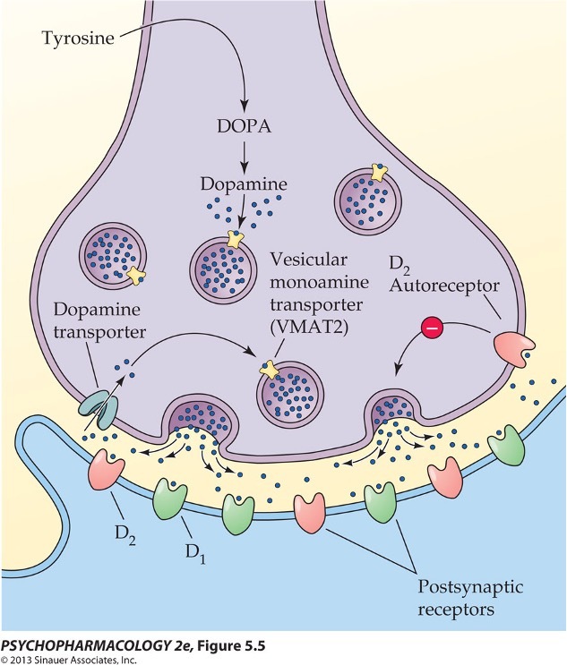 Catecholamine release is inhibited by autoreceptors on neuron cells bodies, terminals, and dendrites. When autoreceptors sense enough NE or dopamine has been released from pre-synaptic neuron, they open up K+ channels and they flow out of the cell to hyperpolarize and stop the action potential. This change reduces the influx of calcium and vesicle exocytosis of these NT. Dopamine transporter then slurps dopamine back up into the presynaptic cleft. Dopamine can also be broken down in the synaptic cleft and presynaptic membrane.