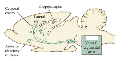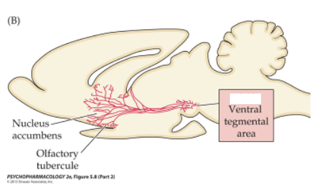 Arises from the ventral tegmental area (right next to substantia nigra) and goes to various structures within the limbic system. This is thought to be the PRIMARY reward pathway. Drugs of abuse totally hijack this pathway.