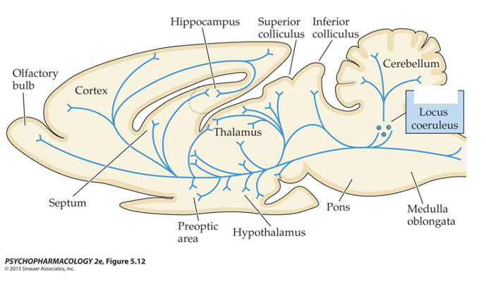Locus coeruleus in the pons is the main collection of NE neurons. They are in the hindbrain with axons that extend throughout the brain and spinal cord.