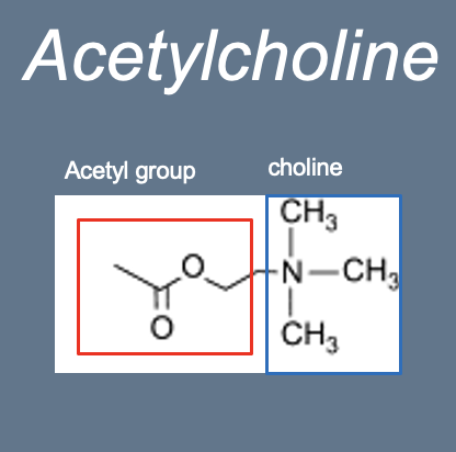 It is an acetyl group attached to a choline group. It is a NT derived from nutrients and not amino acids.