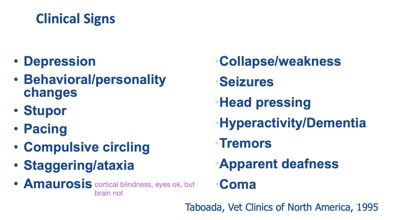 4. Combination of ptyalism, severe ataxia, head pressing, circling