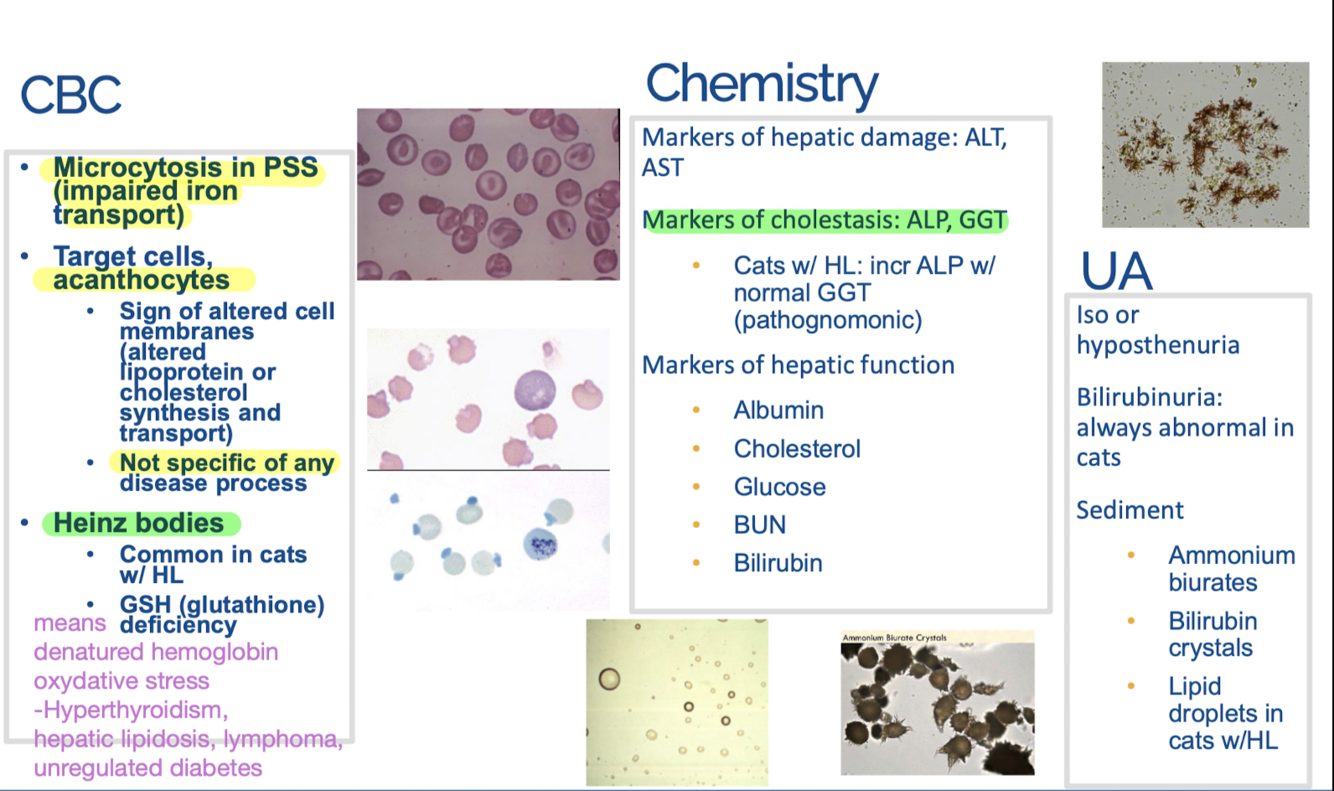 -Poikilocytes (abnormally shaped RBCs): particularly in cats with PSS or other hepatobiliary disease