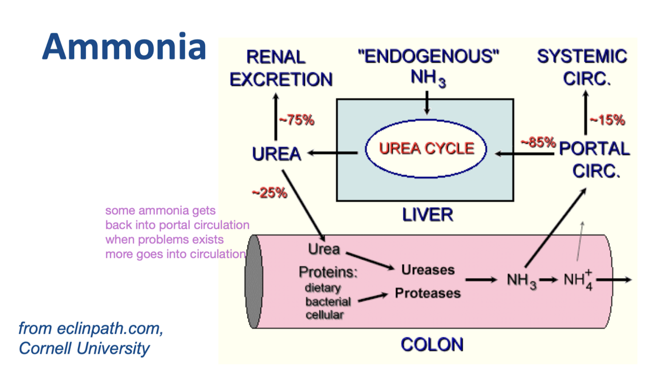 -Ammonia detoxification mainly performed in liver via portal circulation unless shunt present