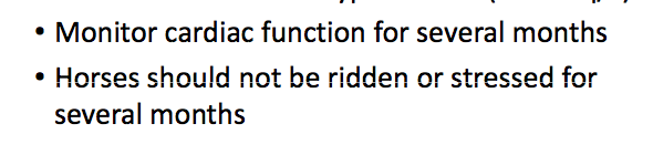 *The Damage in the Cardiac Muscle is going to Heal by Fibrous or Scar Tissue- Horses that survive may suffer Myocardial Scaring and Necrosis. If the Horse survives the Toxicosis, they can still die suddenly weeks or months later due to Heart Damage. Need to avoid STRESS in these Horses