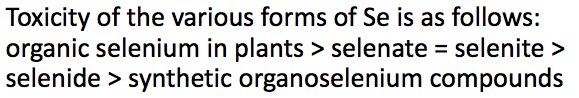 *Toxicity: Organic Selenium in Plants > Selenate = Selenite > Selenide > Synthetic Organoselenium Compounds