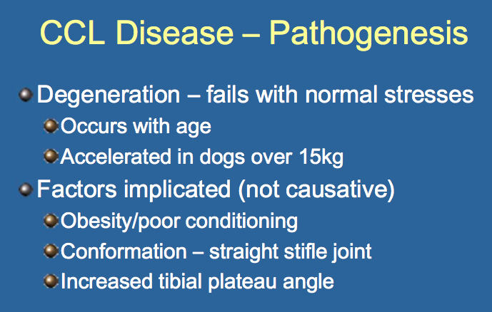 Degeneration of Cranial Cruciate Ligament Occurs with Age- This Degeneration tends to be worse in Larger Dogs (Over 15 kg/ 30lbs)